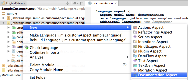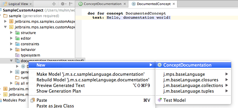 After making/rebuilding the documentation language, it's already possible to create a documentation aspect in the sample language and create a doc concept in it.