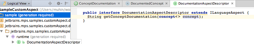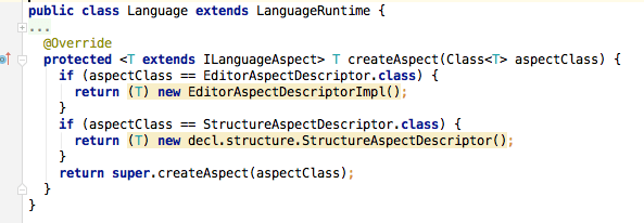 Essentially, we're adding a check for the DocumentationAspectDescriptor interface to the generated Language class and return a fresh instance of the DocumentationDescriptor, if the requested aspectClass is our custom aspect interface.