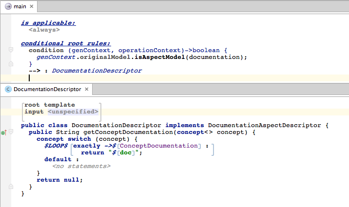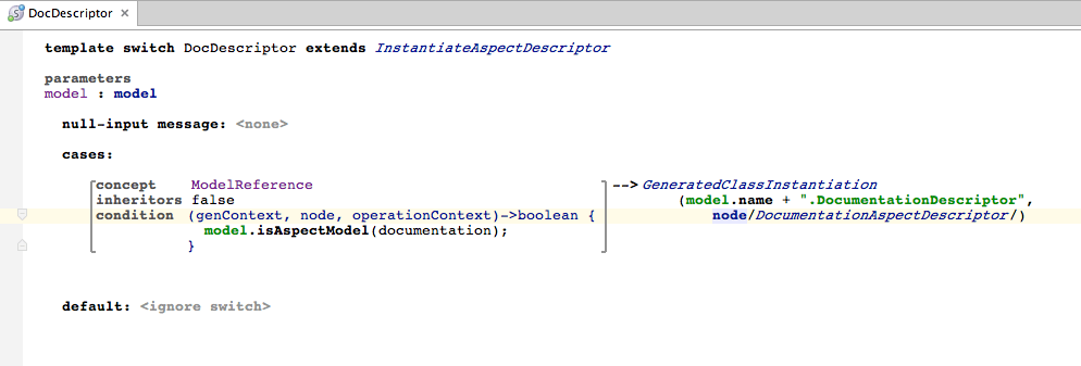 So we have an interface and an implementation class. Now, we need to tie them together - we have to generate the part of the LanguageRuntime class, which will instantiate our concept, i.e. whenever the documentation aspect is required, it will return the DocumentationDescriptor class. To understand how the following works, look at how the class Language.java is generated (see Language class in model j.m.lang.descriptor.generator.template.main). The descriptor instantiation is done by a template switch called InstantiateAspectDescriptor, which we have to extend in our new aspect language so that it works with one more aspect model: