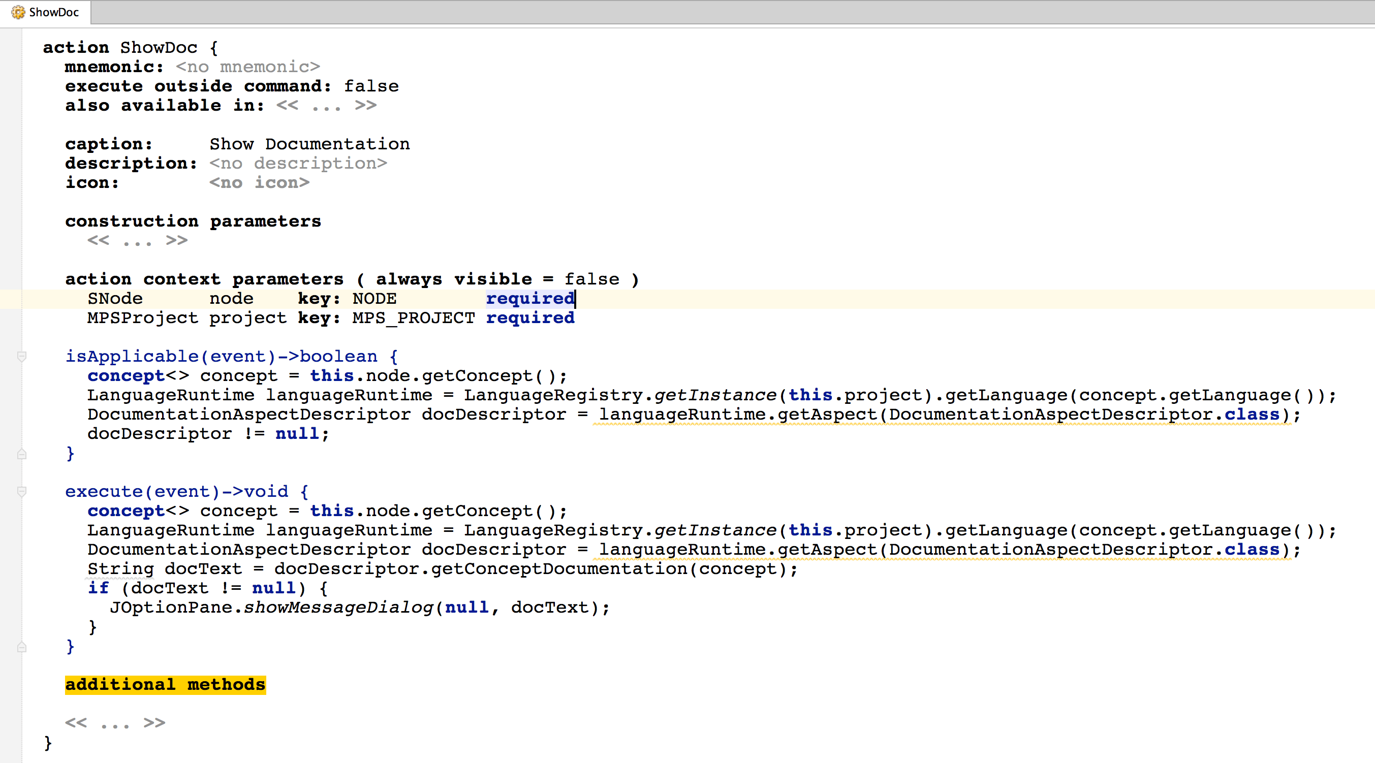 The only thing left is using our new aspect. For that purpose, an action needs to be created that will show documentation for a concept of a node under cursor on demand: