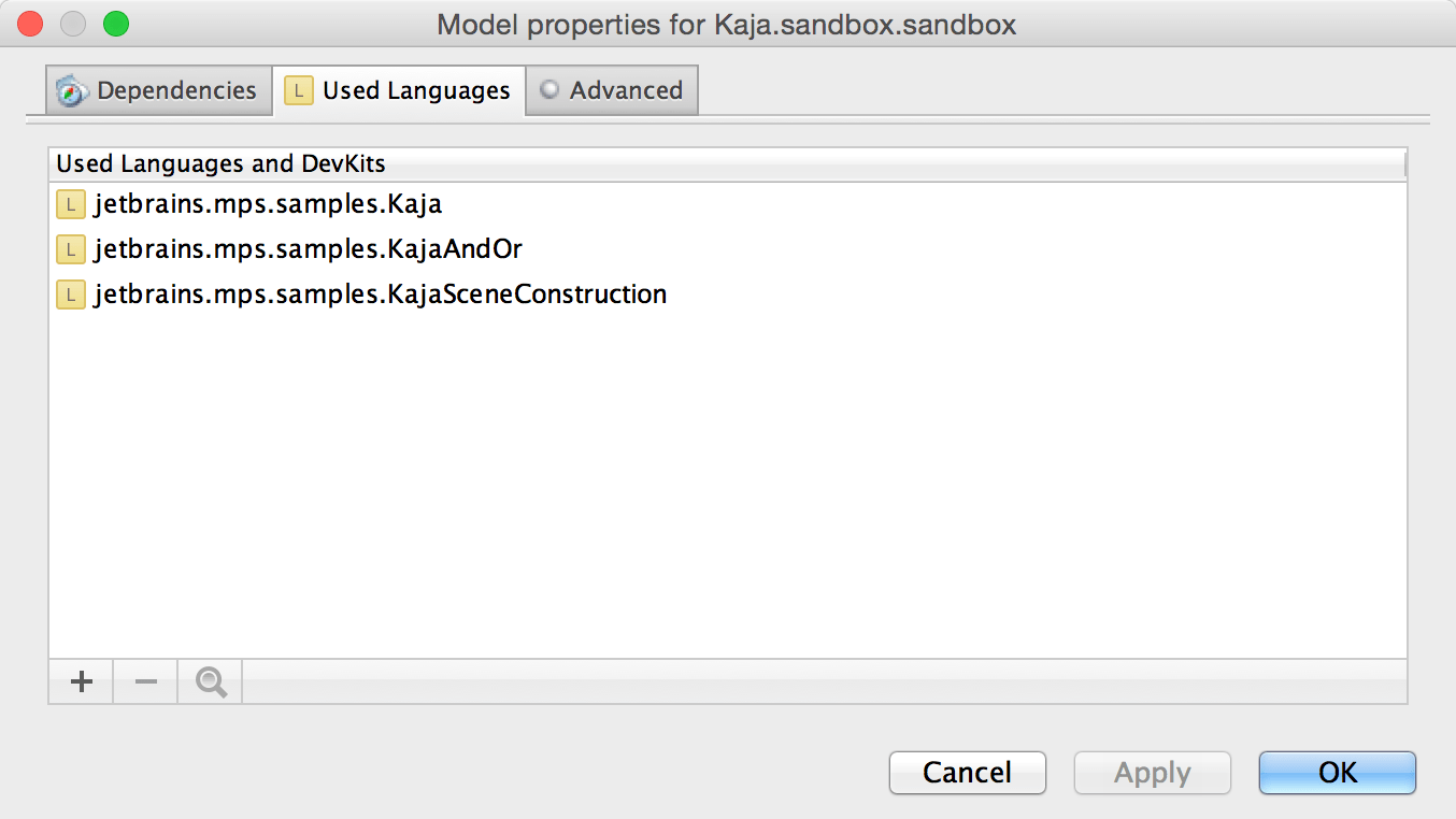 In addtion, since MPS is a multi-language development environment, models can specify the languages (aka syntaxes) enabled in them. This is different from when writing code in Java, Ruby or other languages, where the language to be used is given and fixed by conventions (e.g. the file extension).