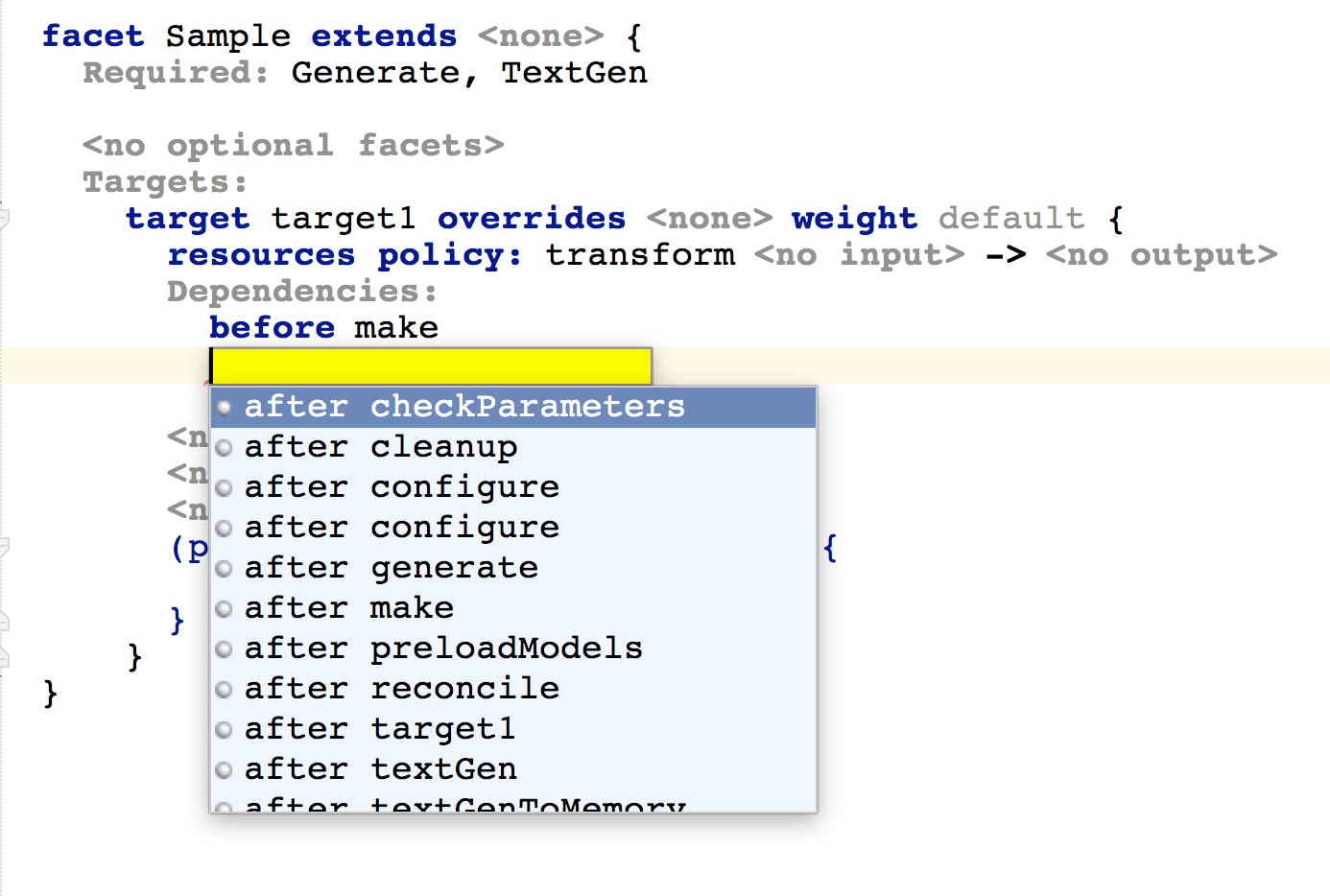 The facet is called runMake. It depends on TextGen and Generate. The dependencies to those two facets has to be specified so we can then declare our targets' priorities relative to targets in those facets.
