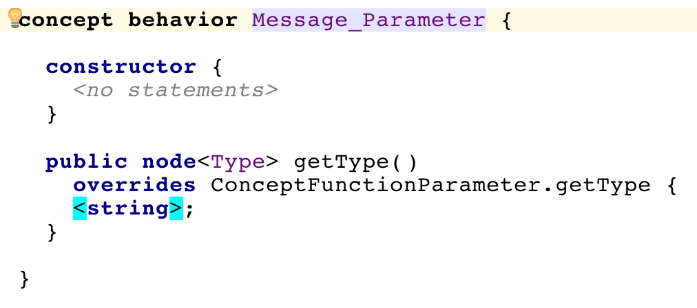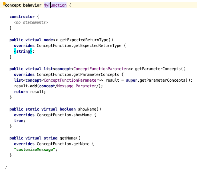 Since MyFunction requires an argument to hold the original trace message value, we also need to create a concept to represent that parameter, which extends the ConceptFunctionParameter concept and specifies its type through an overridden getType() behavior method: