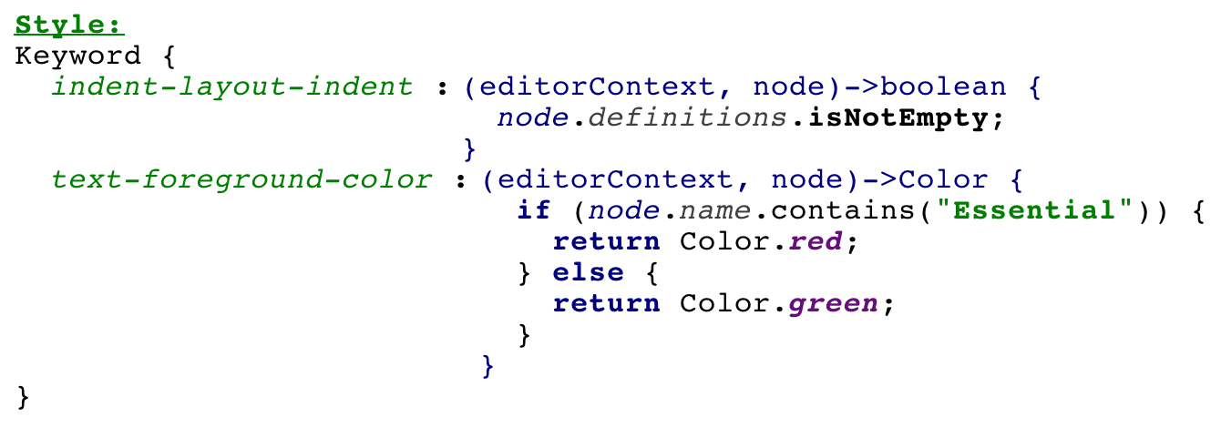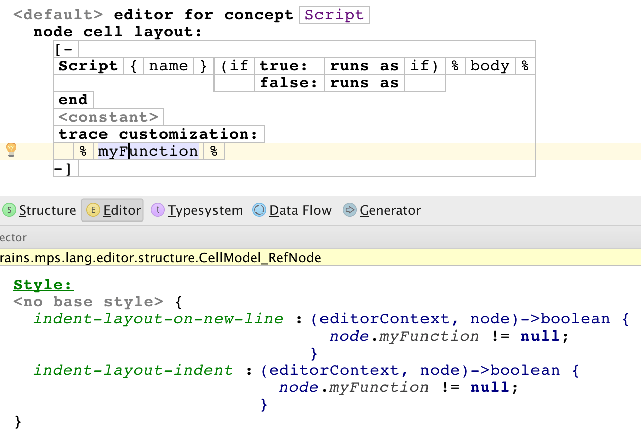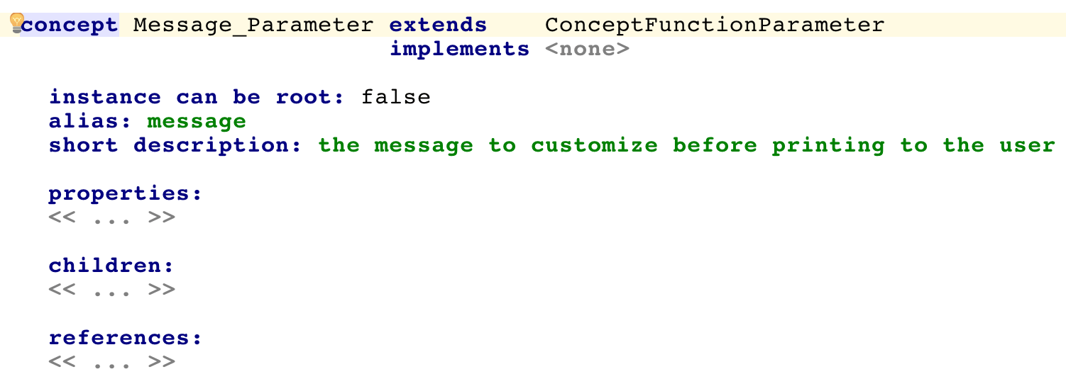 Concept functions allow language designers to leave hooks for their language users, through which the users can provide code to leverage in the generated code. For example, most of the languages that MPS offers for language design, such as Editor , Constraints or Intentions, leverage Concept functions:
