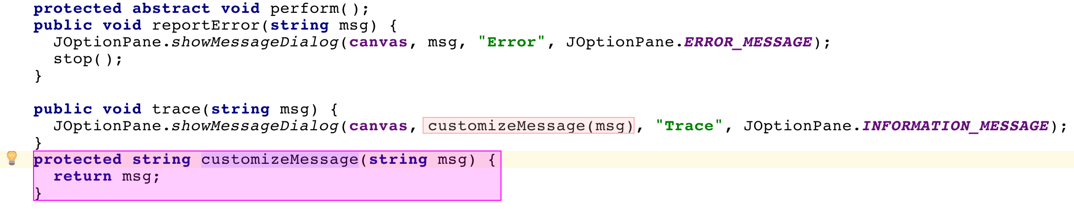 The trace() method needs to call the new customizeMessage() method in order to have the original trace message customized. The default implementation of customizeMessage() method returns the message without any alteration.