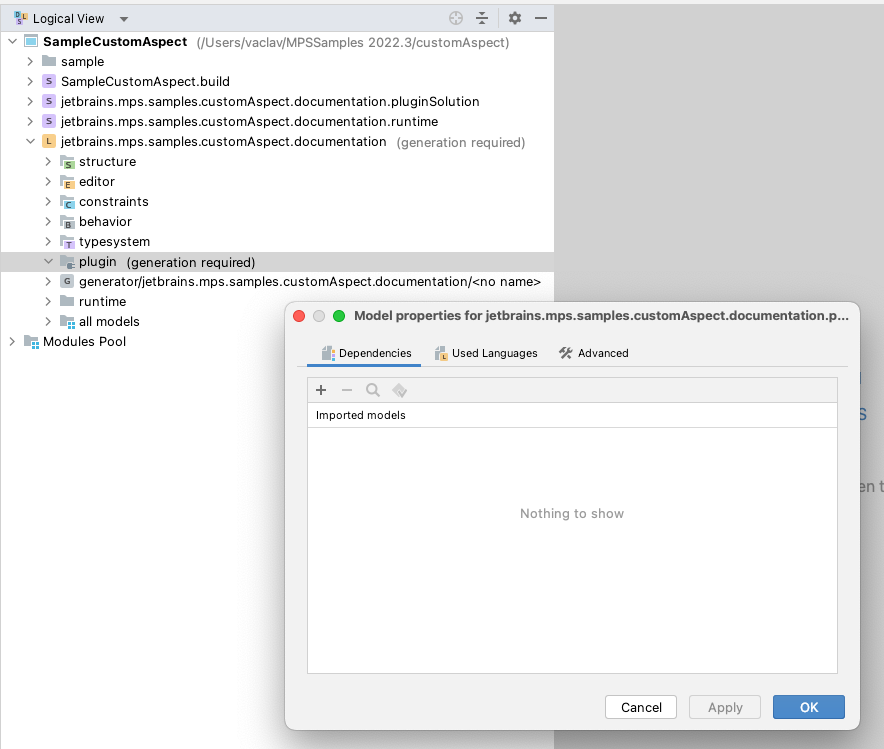To make MPS treat some special model as a documentation aspect (that is our new custom aspect), an aspect declaration should be created in the documentation language. To do so, we create a plugin aspect in the language and import the jetbrains.mps.lang.aspect language.