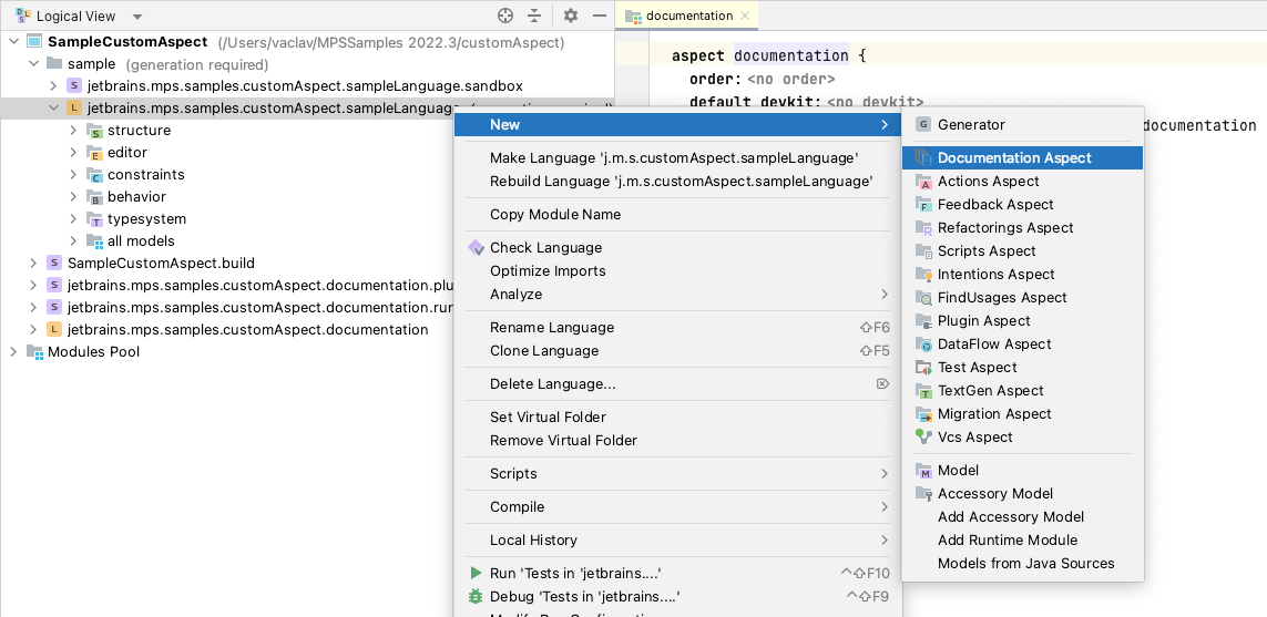 After making/rebuilding the documentation language, it's already possible to create a documentation aspect in the sample language and create a doc concept in it.