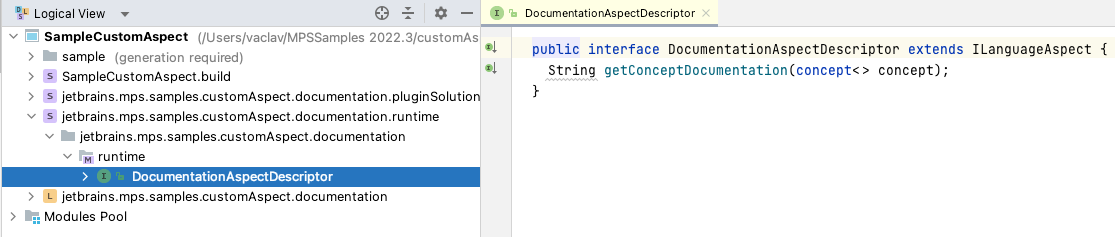 Essentially, we're adding a check for the DocumentationAspectDescriptor interface to the generated Language class and return a fresh instance of the DocumentationDescriptor, if the requested aspectClass is our custom aspect interface.