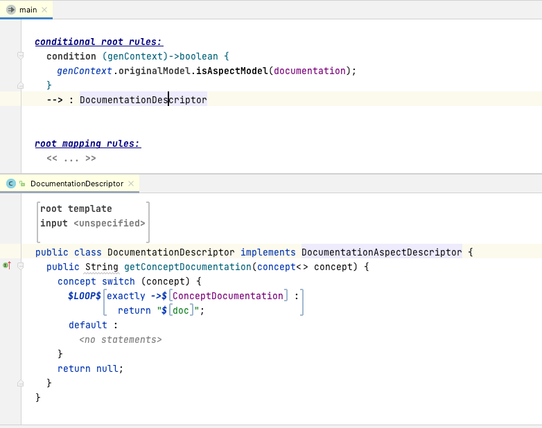The condition ensures that the rule only triggers for the models of your custom aspect, i.e. in our case models that hold the documentation definitions (jetbrains.mps.samples.customAspect.sampleLanguage.documentation ).The useful feature here is the concept switch construction, which allows you to ignore the concept implementation details. It simply loops through all documented concepts (the LOOP macro) and for each such concept creates a matching case (exactly ->$[ConceptDocumentation]) that returns a string value obtained from the associated ConceptDocumentation.