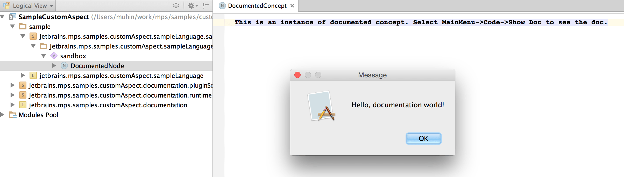 Let's now try it out! Rebuild the project, create or open a node of the DocumentedConcept concept in the sandbox solution and invoke the Show Documentation action from the Code menu: