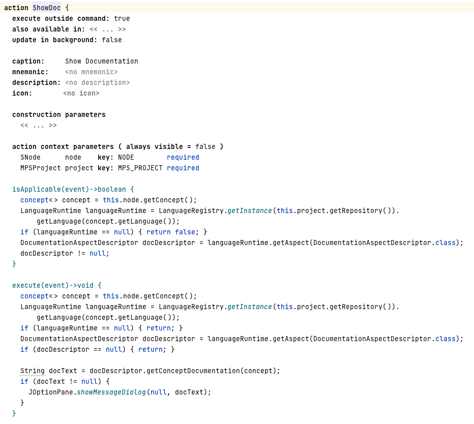The only thing left is using our new aspect. For that purpose, an action needs to be created that will show documentation for a concept of a node under cursor on demand: