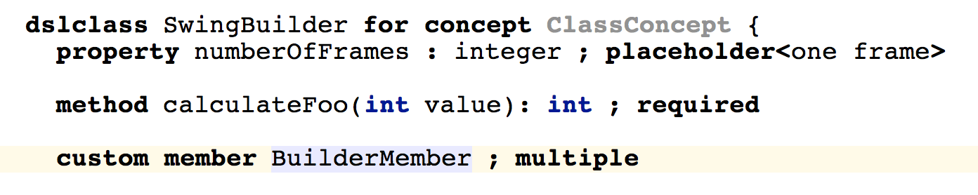 The core idea behind the Lightweight DSL language is to allow the DSL designer to define interfaces with constraints, such as optional methods and properties, types depending on constraints, optional method parameters, custom class members and others. The DSLDescriptor concept represents nodes that codify such constrained interfaces that should be enforced on implementing Classes. For example, the following DSLDescriptor instance will weave a numberOfFrames property into classes as well as a calculateFoo() method and a custom BuilderMember node: