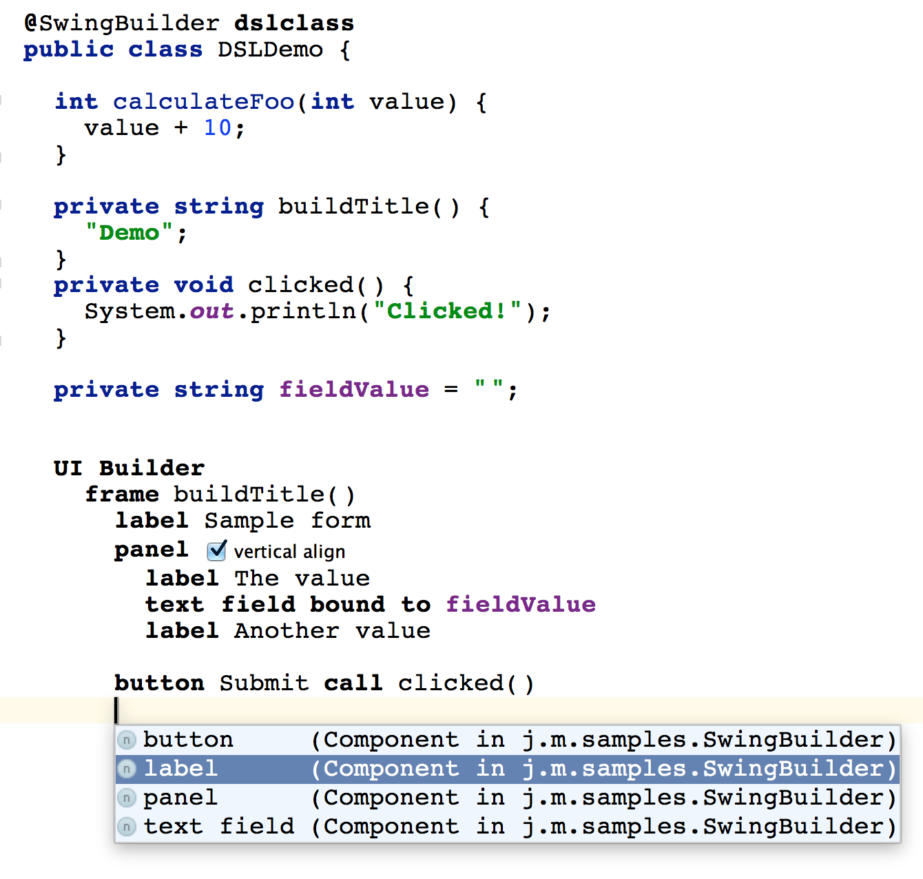 Methods provide a very convenient way to let users of your lightweight DSL inject code - the DSLDescriptor specifies method signatures of methods that the enhanced classes can or must implement. Unlike for normal methods, the return type as well as the types of any parameters of these weaved methods can be decided based on the actual usage in the host (enhanced) class.