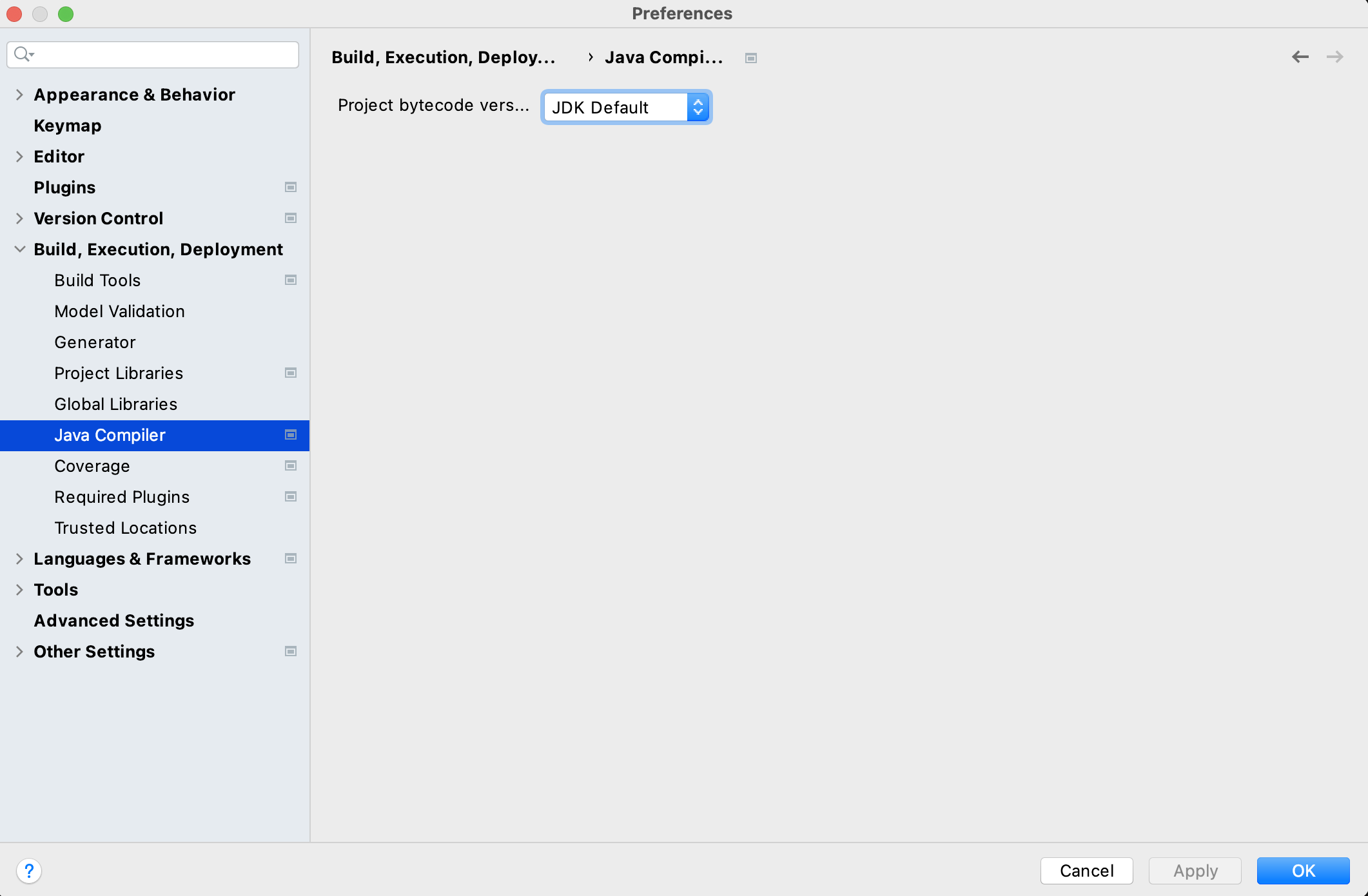 The Java Compiler configuration tab in the preferences window only holds a single setting - Project bytecode version.