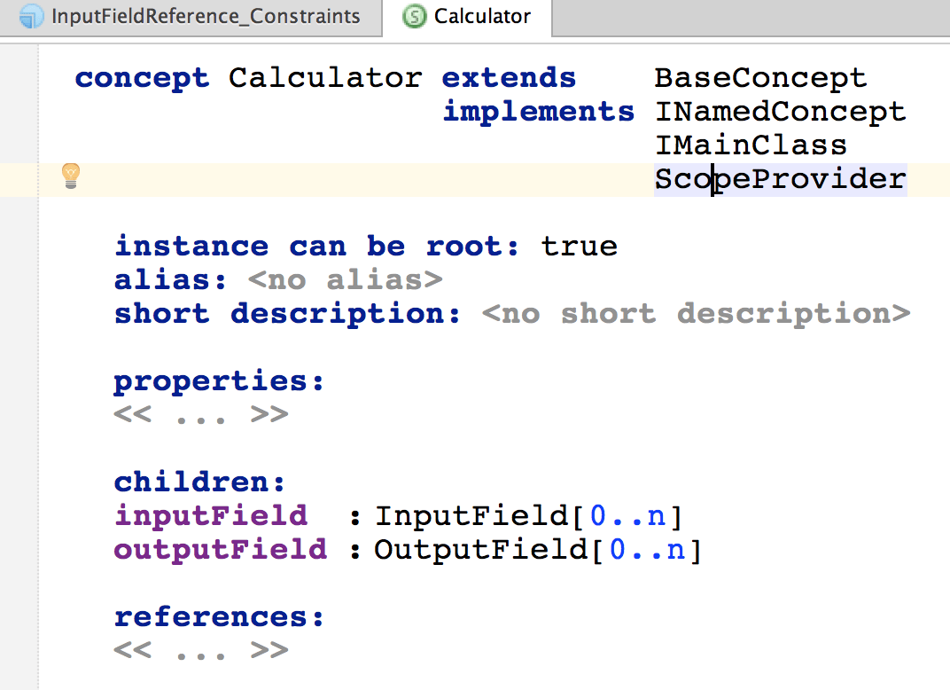 Once we have specified that the scope for InputFieldReference when searching for an InputField is inherited, we must indicate that Calculator is a ScopeProvider. This ensures that Calculator will have say in building the scope for all InputFieldReferences that are placed as its descendants.