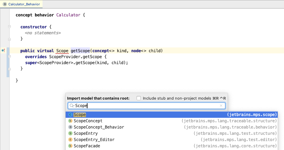 If Scope remains unresolved, we need to import the model (Control + R) that contains it (jetbrains.mps.scope):