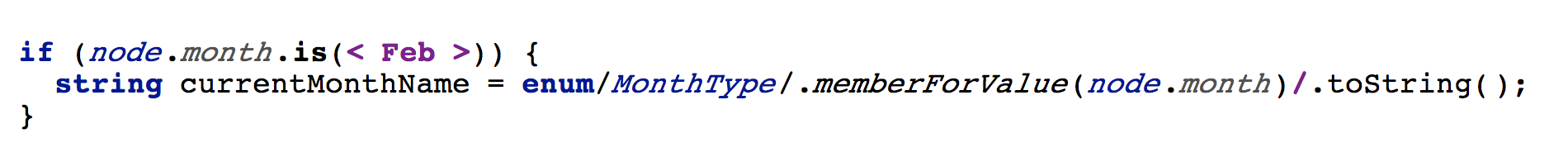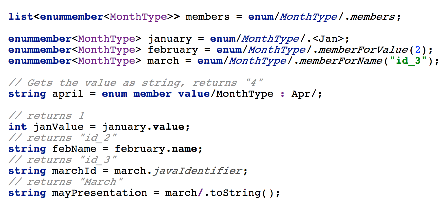 Enumeration members can be queried for their name and presentation. Checking a value of a property against an enum data type value can be done with the is operation.