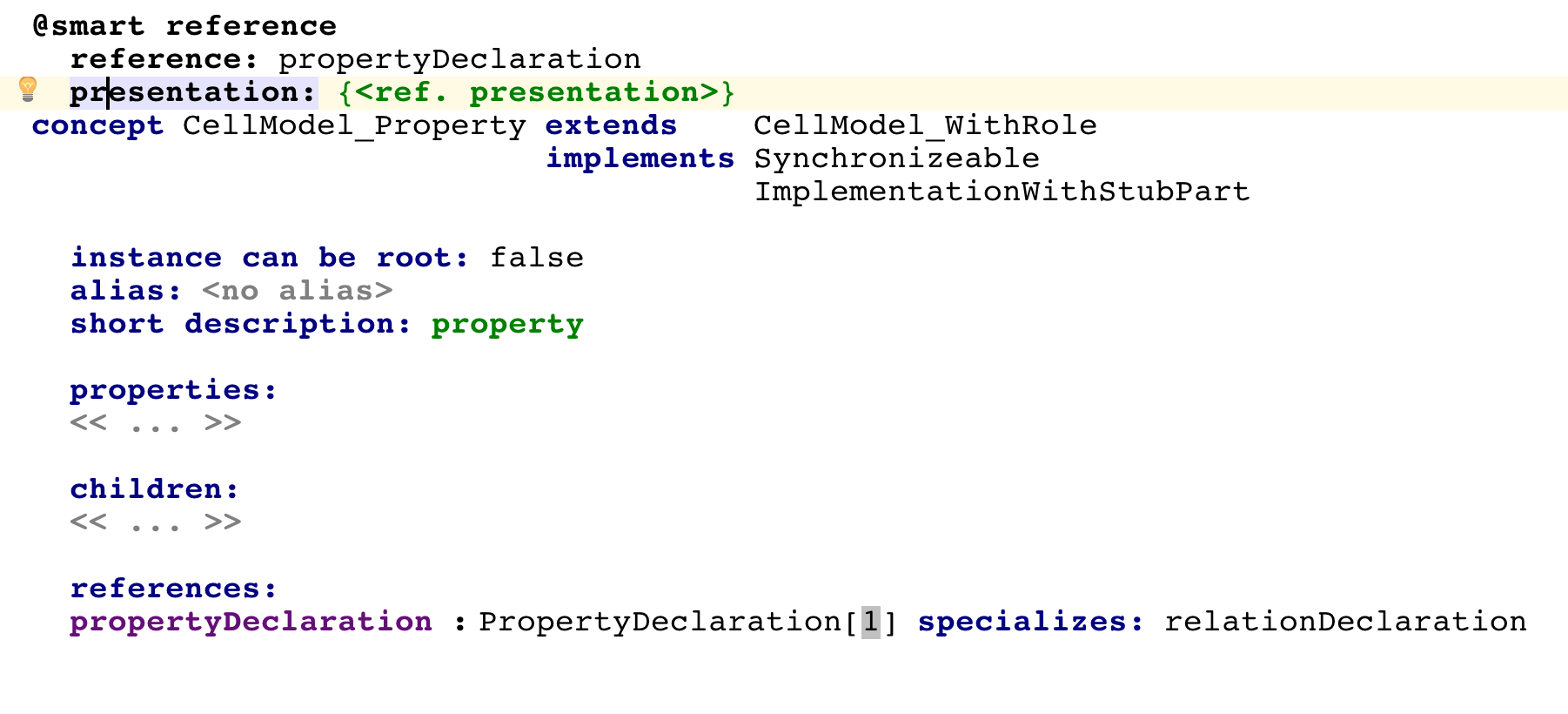 A node containing a single reference of 1:1 cardinality and with no alias defined is called a smart reference. These are somewhat special references. Provided the language author has not specified an alias for them, they do their best to hide from the language user and be as transparent as possible. MPS treats the node as if it was the actual reference itself, which simplifies code editing and code-completion. For example, default completion items are created whenever the completion menu is required: for each possible reference target, a menu item is created with matching text equal to the presentation of a target node.