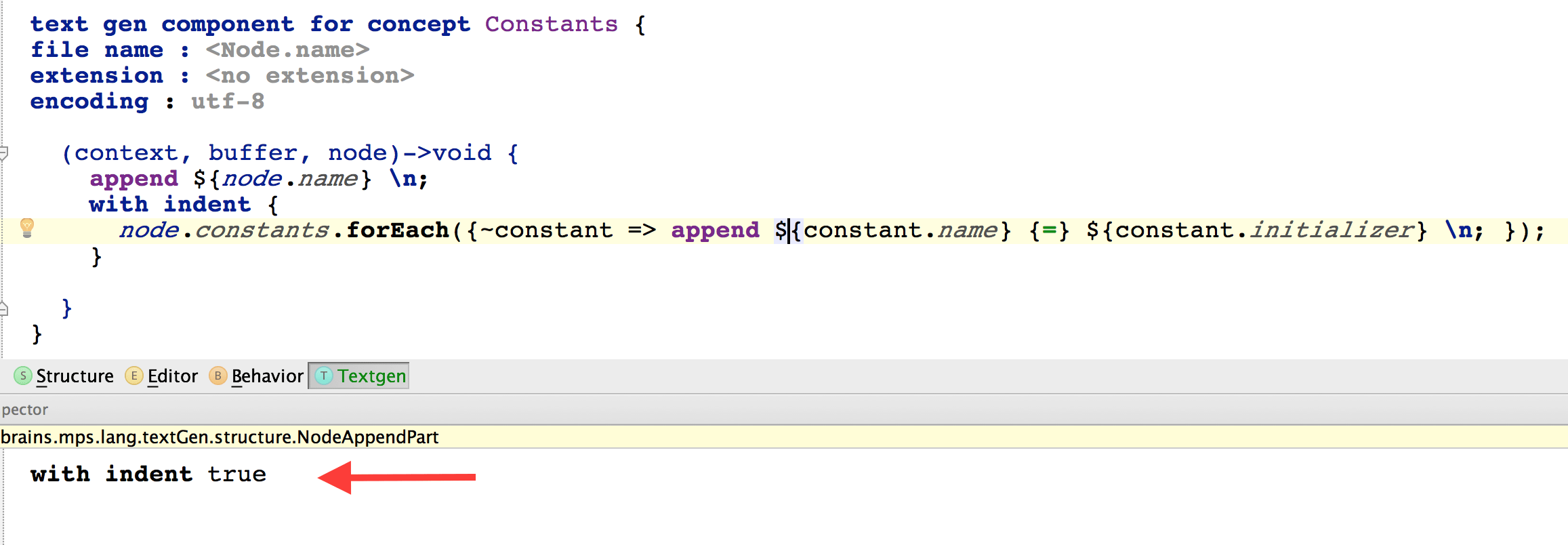 The "indentation", however, must be inserted into the output stream explicitly by the append commands. Simply marking a block with with indent will not automatically indent the text generated by the wrapped TextGen code. The with indent block only increases the value of the indentation buffer, but the individual appends may or may not wish to be prepended with the indentation buffer of the current size.