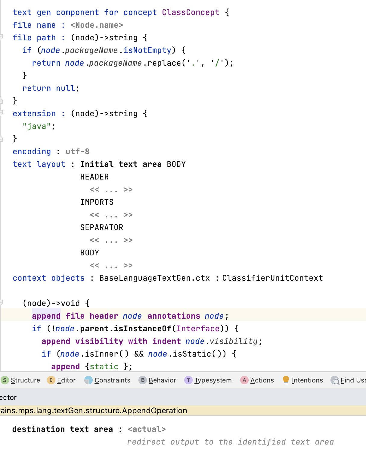 Text generation is not always possible in a sequence that corresponds to lines in a physical file. For example, a Java source, one could distinguish 2 distinct areas, e.g. imports and class body, where imports is populated along with the body. A passionate language designer might want to break up the file further, e.g. up tofile comment , package statement , imports, and class body that consists of fields and methods, and populate each one independently while traversing a ClassConcept. That's what we call a layout of an output file, and that's what we give control over now. MPS veterans might be aware of two buffers (TOP and BOTTOM) that used to be available in TextGen for years. These were predefined, hard-coded values. Now it's up to language designer to designate areas of an output file and their order.