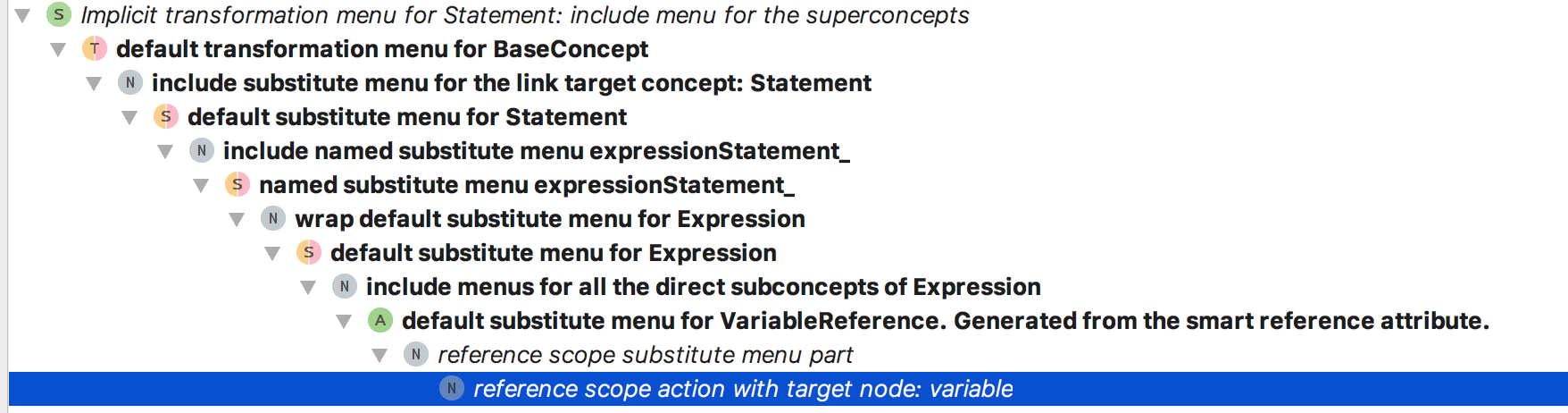 We see that what we see in completion is the default transformation menu for the Statement which includes the menu for superconcept which is the BaseConcept. It in its turn includes the substitute menu for the Statement, which in it's turn wraps the menu for the Expression. Then it comes to subconcepts of Expression, one of which is the VariableReference. VariableReference is the "smart reference" concept, so it tries to find all visible target of the Variable concept. So that's how the variable reference appears in the menu for the statement.