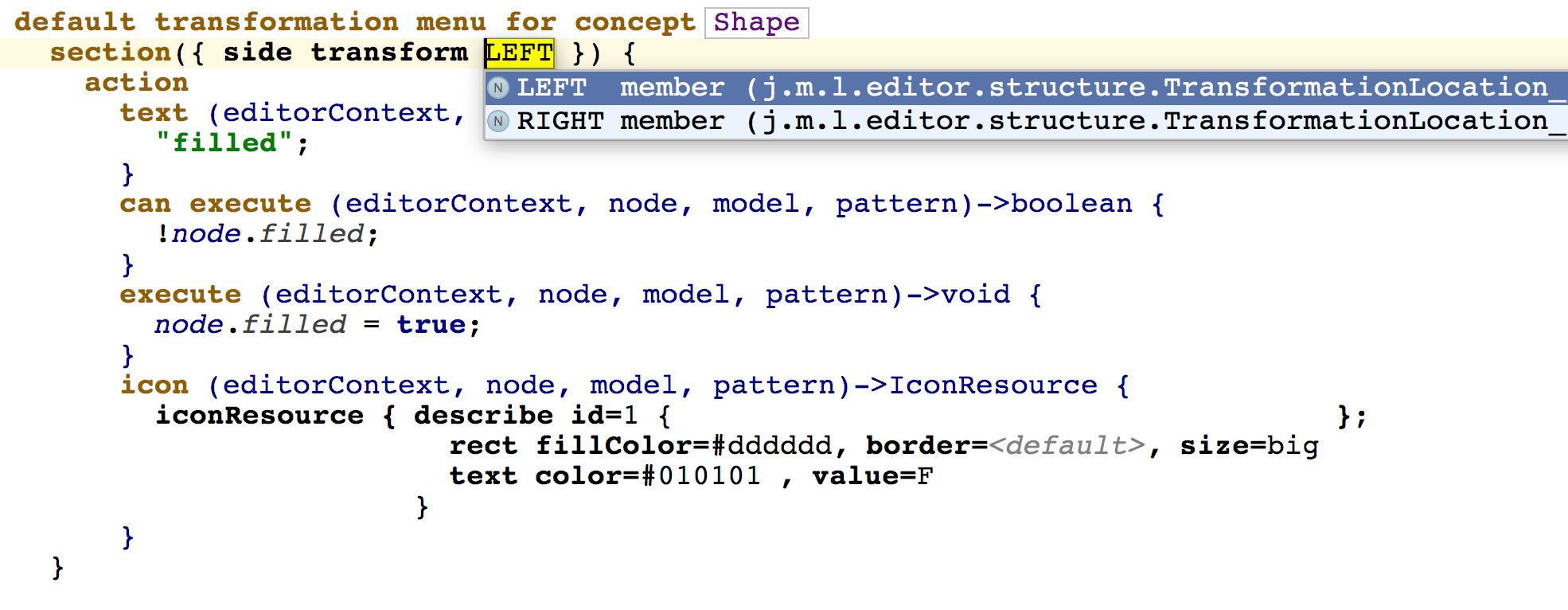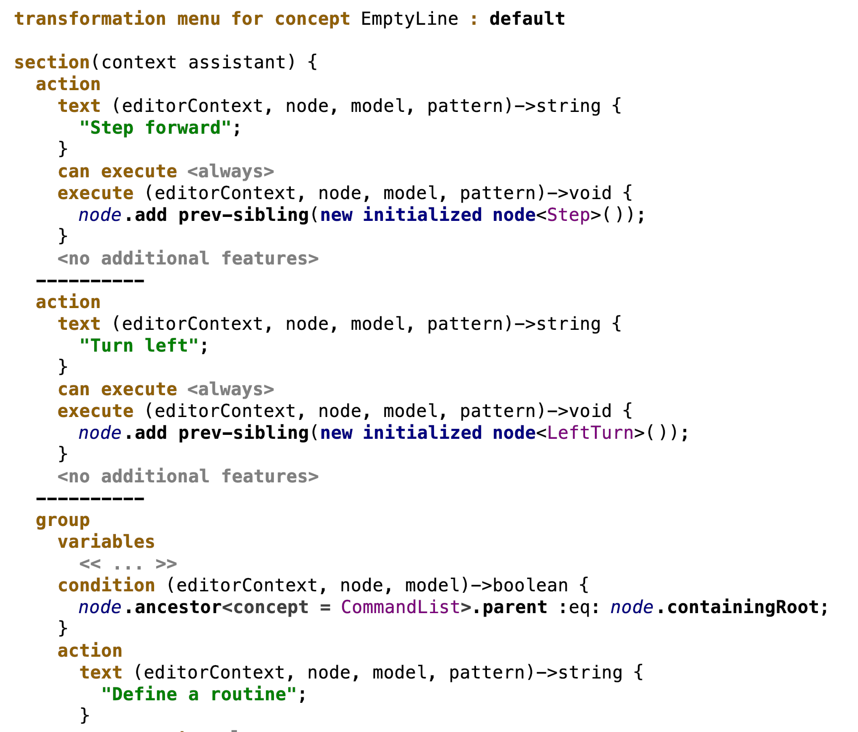 Transformation menu language is used to define transformation menus that describe a hierarchical structure of submenus and actions that will appear in various locations in the editor. Currently there are several possible locations where transformation menus are shown: side transform menus, substitute menus , context assistant, and context actions tool. Language designers and plugin authors can define additional locations and specify required or optional features for each location (such as an icon or a tooltip), as documented in Extending the Transformation Menu Language.