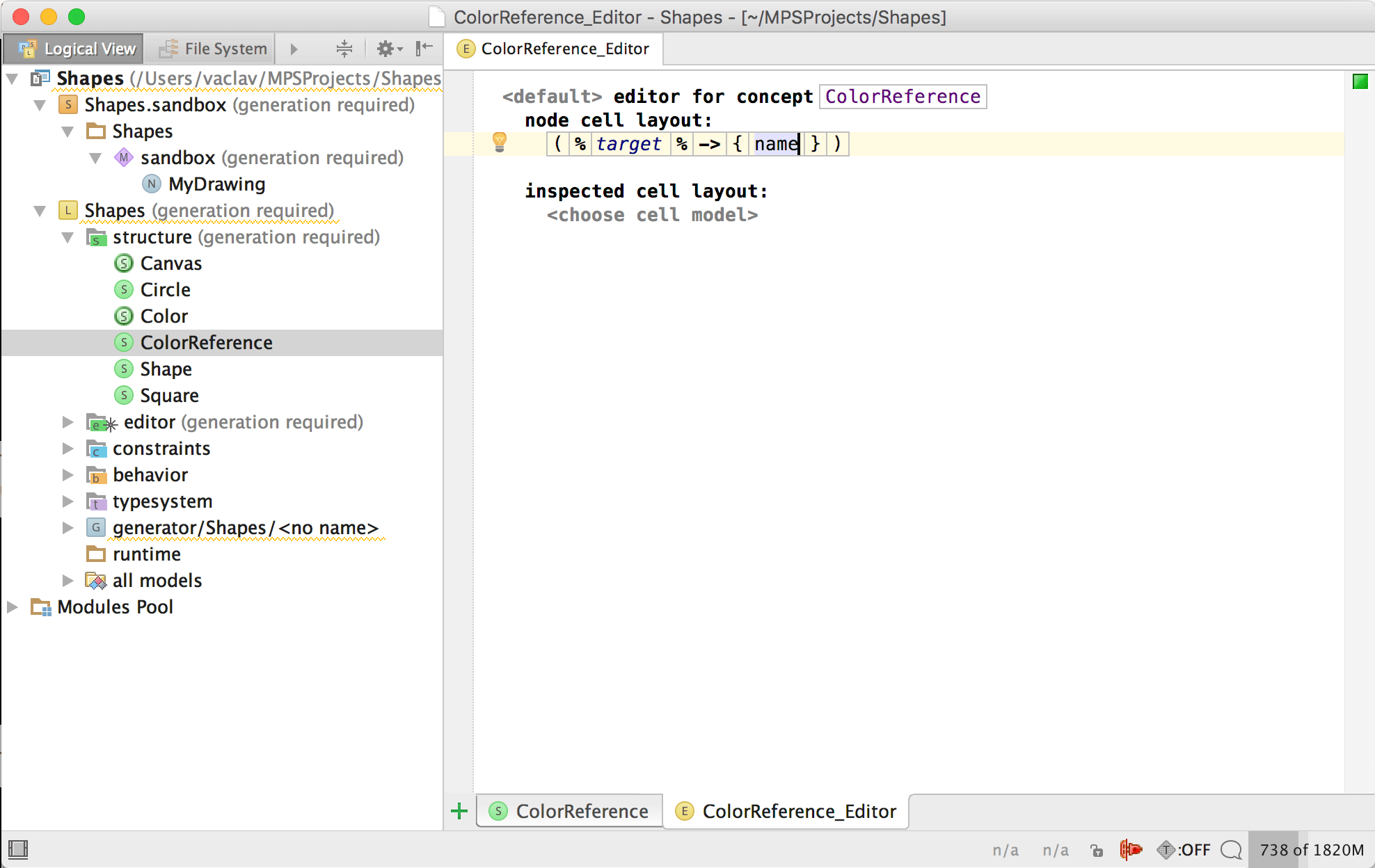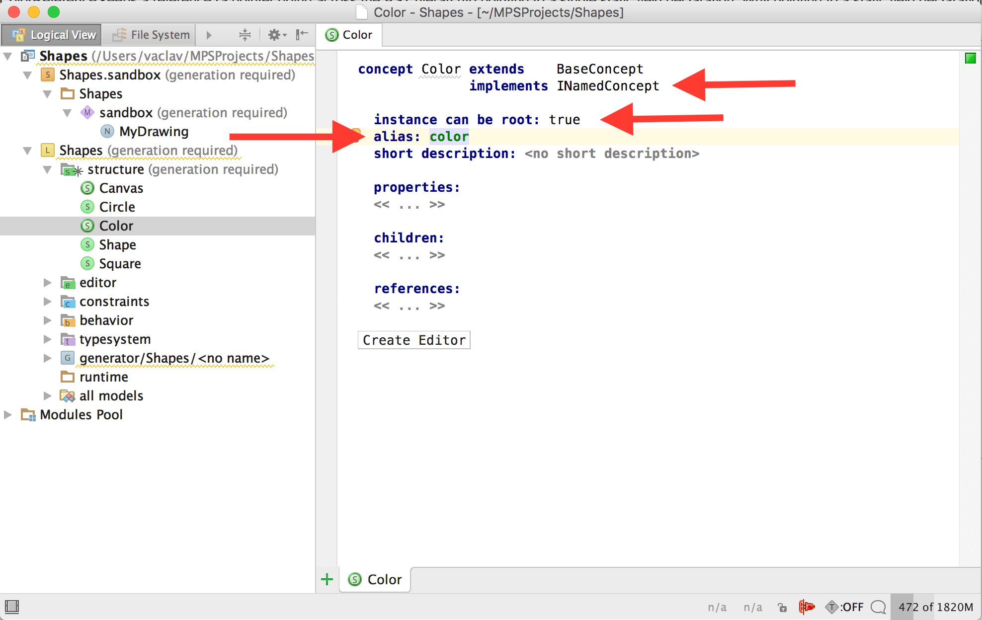 We should give the Concept a descriptive name, Shape in our case will work fine. So just type Shape where MPS indicates a missing name - the red <no name> field.