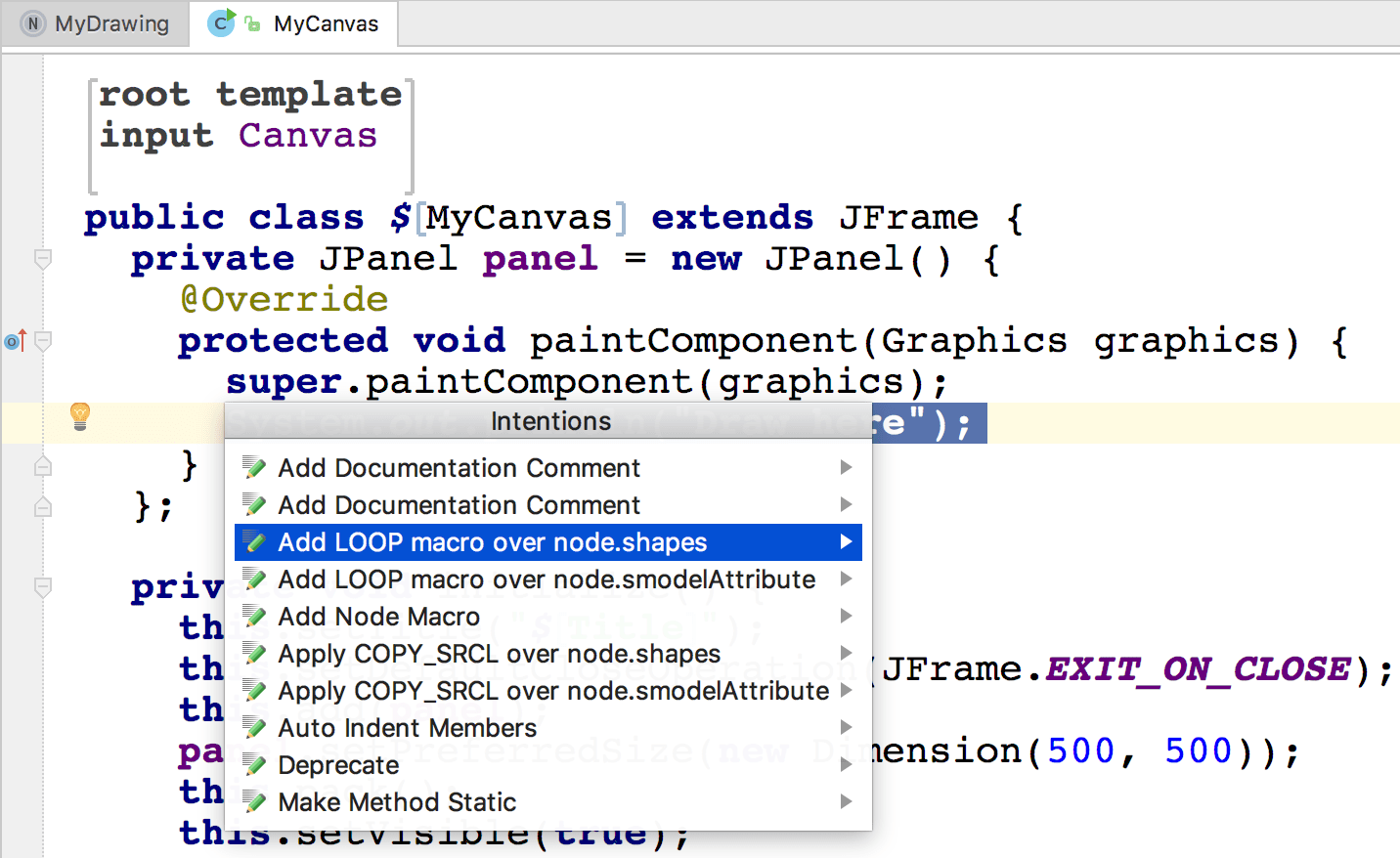 Then insert a COPY_SRCL macro to loop through all the shapes of a Canvas and trigger their reduction rules:
