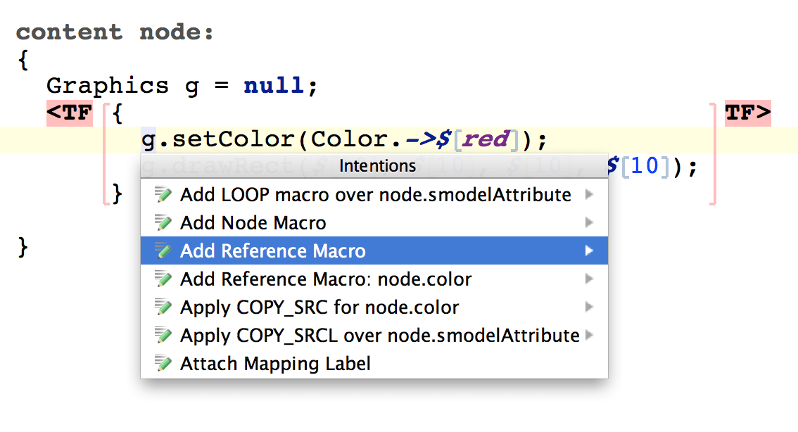 Then repeat the reference macro creation for the second g reference. Both reference macros attached to the g variable reference that you have just created must specify in the Inspector the details on how to obtain the desired target of the reference. The genContext object gives access to helpful methods and properties of the current generation session. Use the "get output for label and input" operation on genContext and provide the graphicsParam mapping label as well as the Canvas holding the currently generated Square.