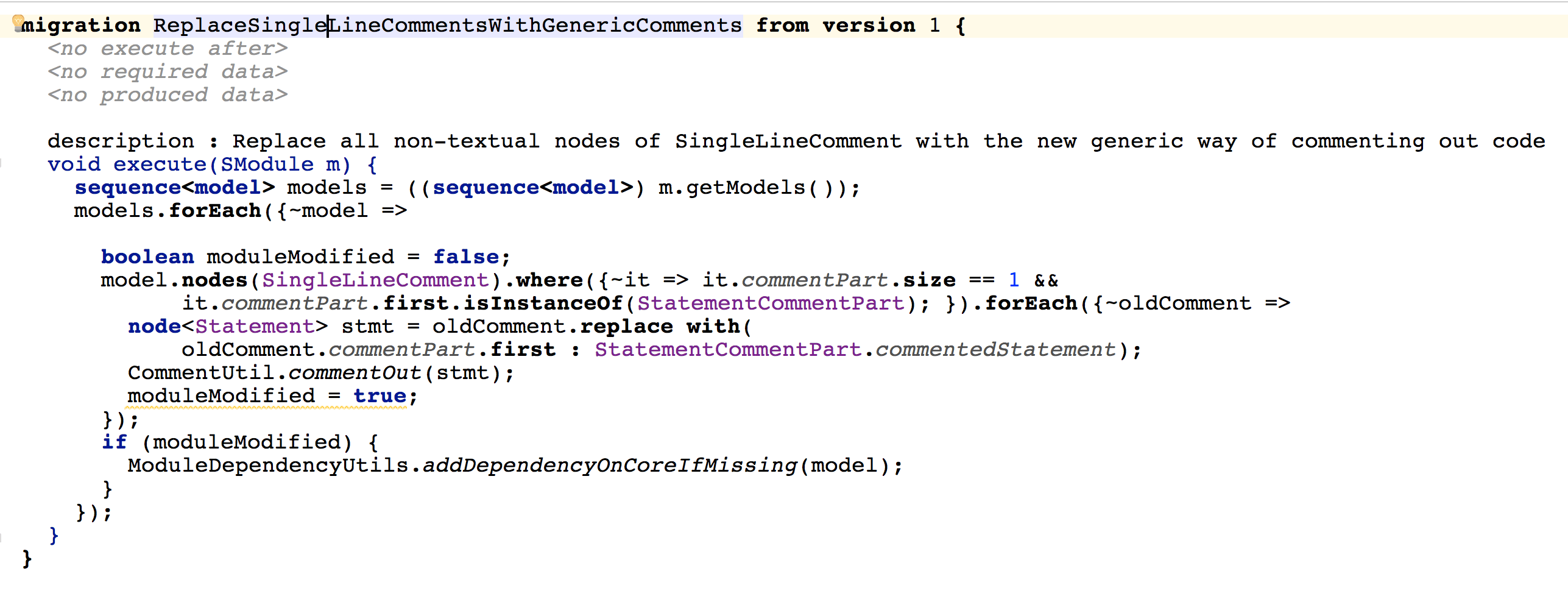 In versions prior to MPS 3.3 language authors had to implement the comment out functionality themselves for each language individually. In MPS 3.3 the custom functionality may be redundant and should be replaced by the generic functionality provided by MPS, perhaps with some customization as described above. The existing usages of the old custom commenting-out functionality should be migrated to the generic version, which should be done in several steps: