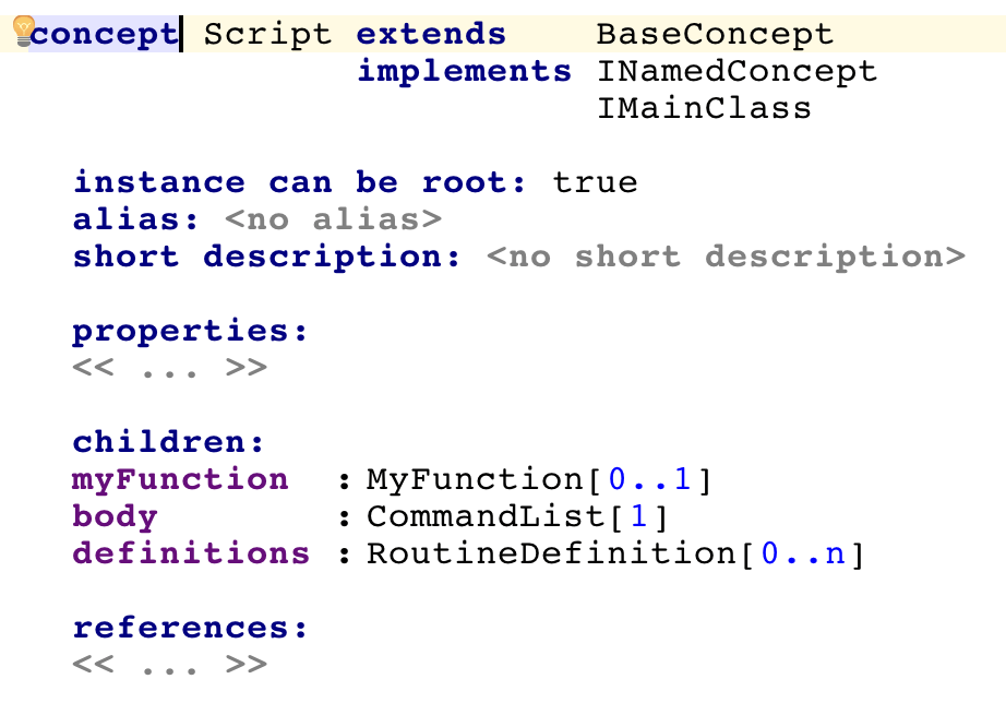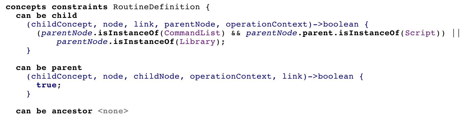 Concept functions allow language designers to leave hooks for their language users, through which the users can provide code to leverage in the generated code. For example, most of the languages that MPS offers for language design, such as Editor , Constraints or Intentions, leverage Concept functions: