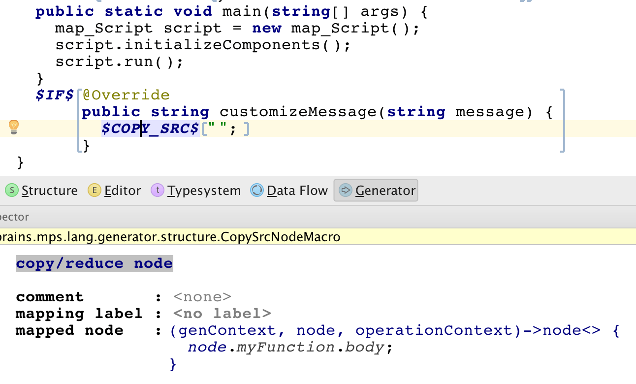 The overriding method only gets generated when the concept function exists in the Script. The generator uses the body of myFunction as a body of the generated customizeMessage() method.