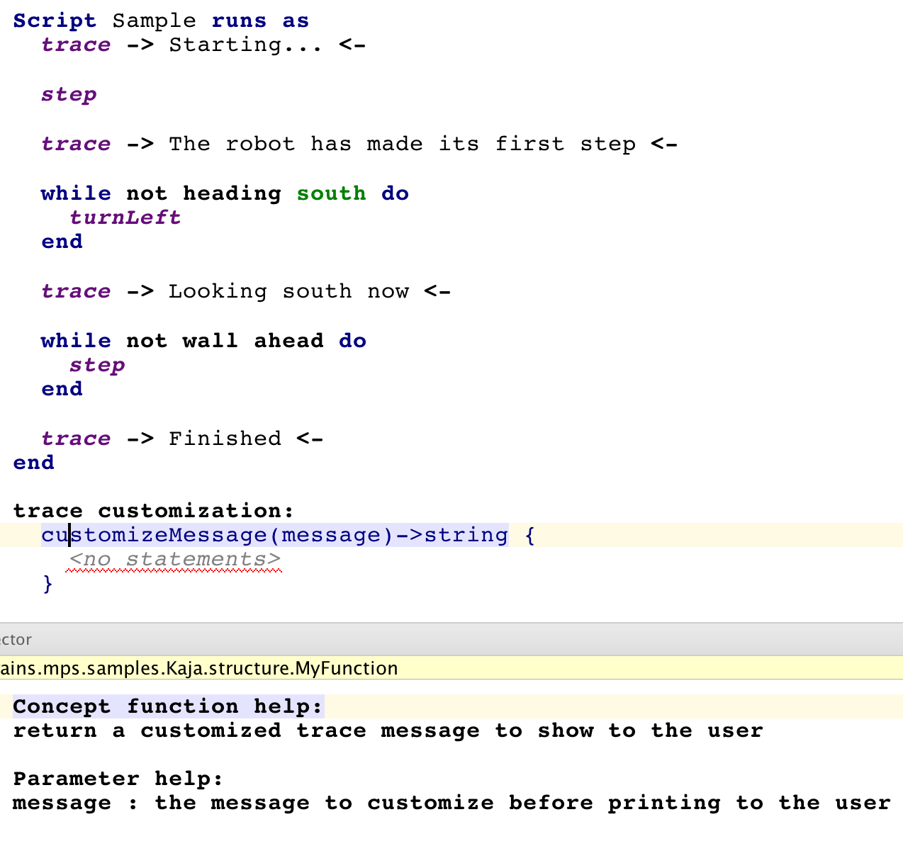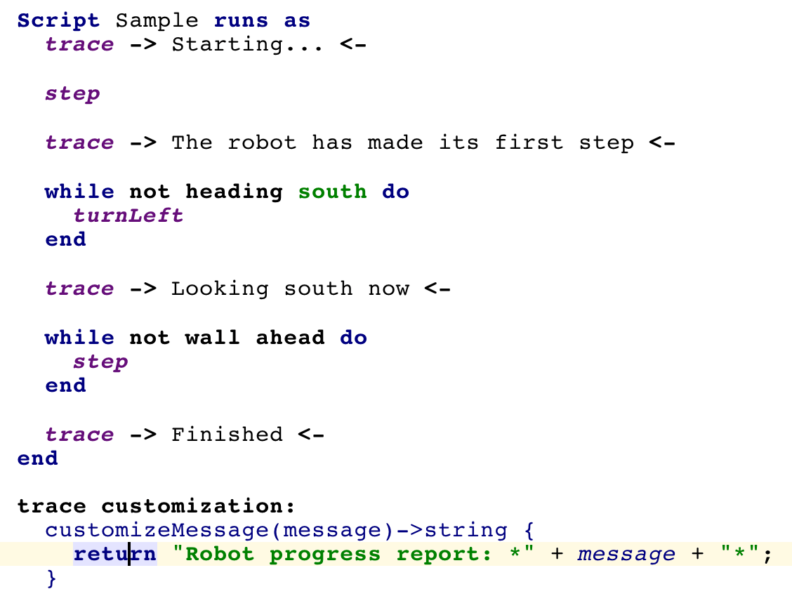 We'll use the Robot Kaja sample project to experiment with Concept functions. The goal is to allow the Script authors to provide a function that will customize the Trace messages, which are reported to the user through the trace command: