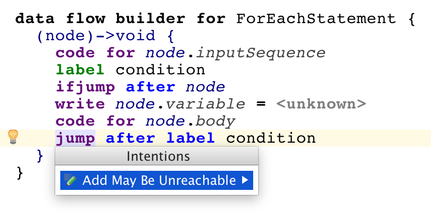 If you generate data flow intermediate code for this statement, the last command: the jump after condition command will be unreachable. On the other hand, it's a legal base language statement, so we want to ignore this command during reachable statement analysis. To do so we mark it is as may be unreachable, which is indicated by curly braces around it. You can toggle this settings with the appropriate intention.