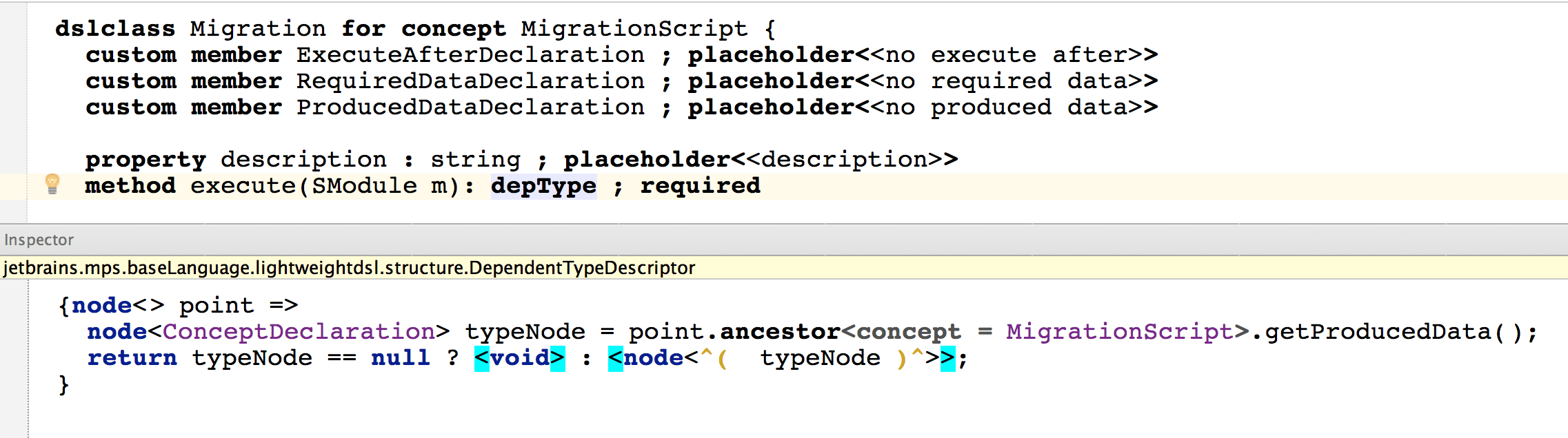 MigrationScript concept, which is a mere BaseLanguage class, is enhanced by the Migration DSLDescriptor that adds a few extra properties, members and custom members