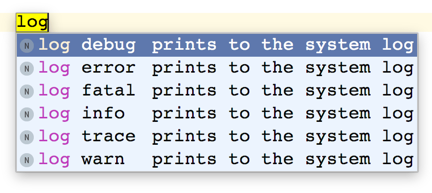 Whenever you want to insert a log statement into code, start by typing either "log" or "message" followed by the desired severity: