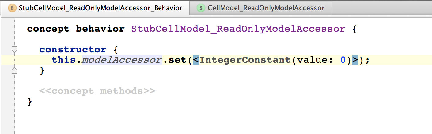 In the behavior aspect in the constructor we then set the reference to point to some dummy node, such as an IntegerConstant. This will ensure the link does not stay empty, yet we avoid the need of creating nodes fully satisfying the original modelAccessor link in the stubbed concept.