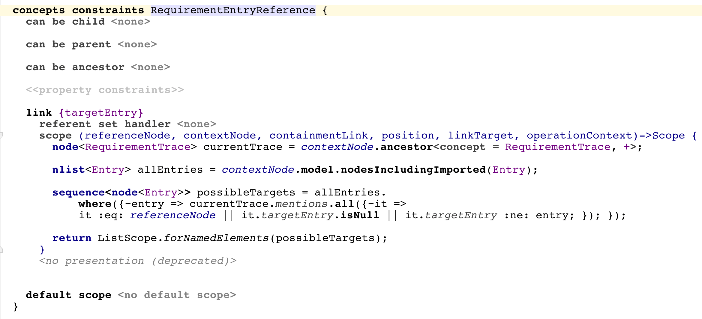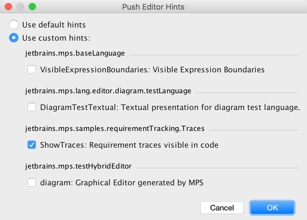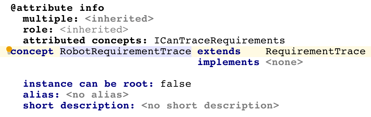 • The Traces languages defines an attribute that can be attached to any node (BaseConcept). The attribute holds references to the requirement entries in the requirement specifications. Two editors are available - a default one, which only shows the original code, and a "ShowTraces" one, which displays the requirement traces next to the code. "Push hints" can be used to switch between the two editors. An intention is available to attach/detach the attribute to nodes. When the RequirementTrace attribute is being added through the intention to a node, the "ShowTraces" editor hint is selected programmatically, so that the user can instantly see the requirement traces in the code. Multiple traces can be specified for an attribute. Scoping for RequirementEntryReference ensures that the user cannot enter a specific trace multiple times for the same attribute.