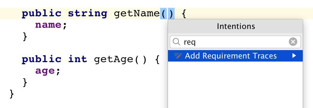 This allows requirement traces to be inserted into code. An intention is available to add/remove traces to a node.