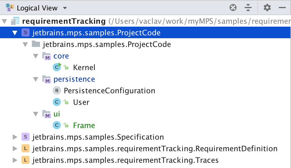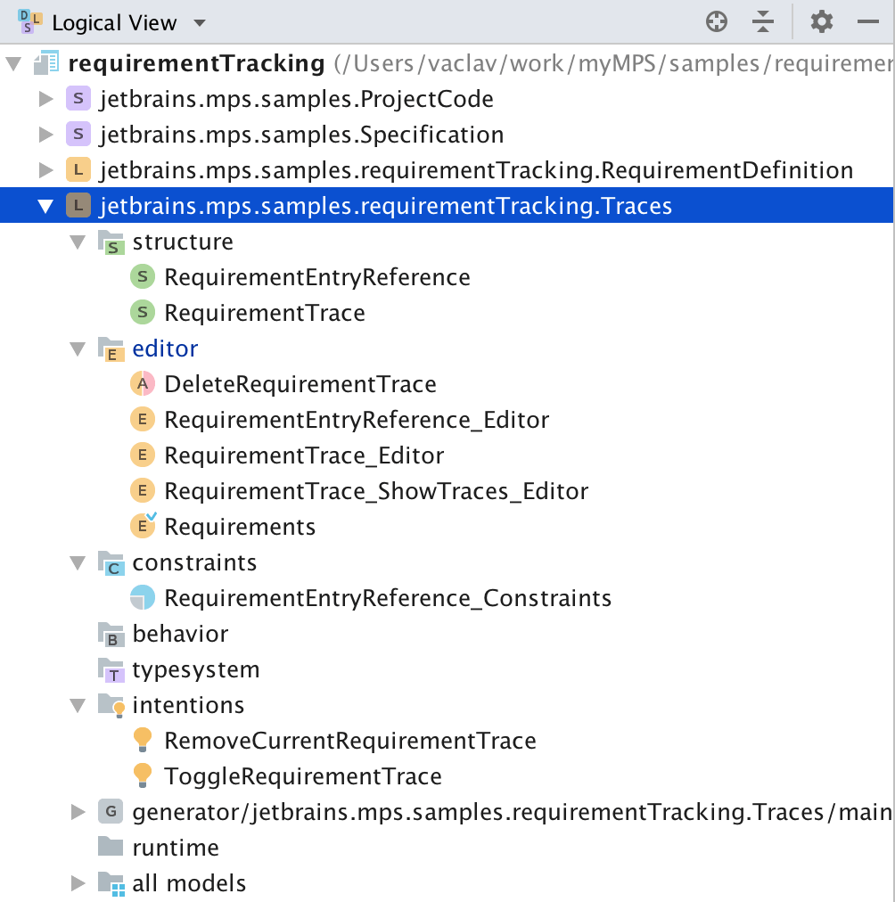 • The ProjectCode solution simulates the actual code of a project that must conform to the specification contained in the Specification solution. The code is organized by functionality into models. Each model imports the relevant specification models from the Specification solution. The code, both Java and XML is annotated with requirement traces. The traces are only visible, when the ShowTraces editor hint is pushed. With intentions additional traces can be added or removed.