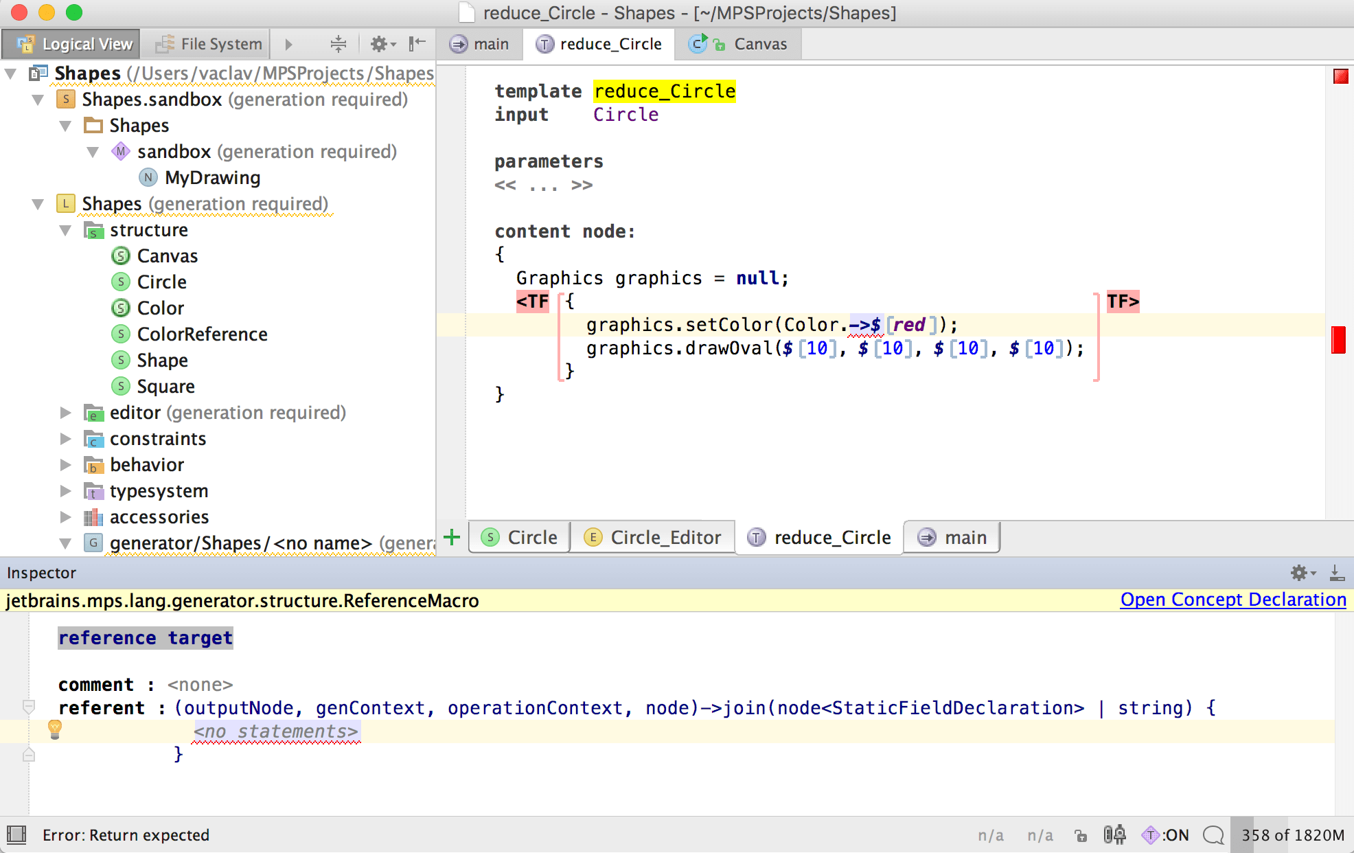 So this is our first concrete concept that will be used by users of our language. To give the concept a nice textual representation in code-completion dialogs and enable MPS to be smart about creating an instance of Circle whenever the user types "circle", you need to give the concept an alias 'circle'.