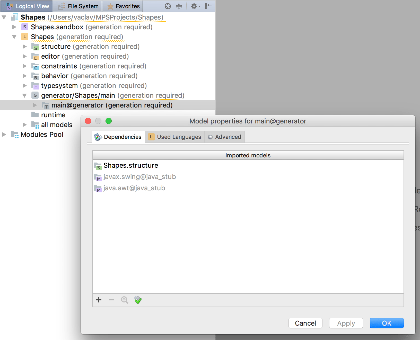Just to give you an idea how the generator could be utilized to generate code in a declarative language, such as xml, here's a simple generator for the Shapes language generating xml. We start from an empty generator. The Java templates and rules have all been deleted: