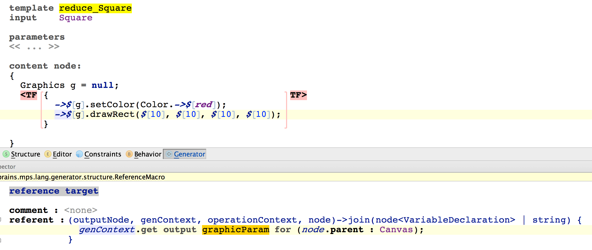 Then repeat the reference macro creation for the second g reference. Both reference macros attached to the g variable reference that you have just created must specify in the Inspector the details on how to obtain the desired target of the reference. The genContext object gives access to helpful methods and properties of the current generation session. Use the "get output for label and input" operation on genContext and provide the graphicsParam mapping label as well as the Canvas holding the currently generated Square.