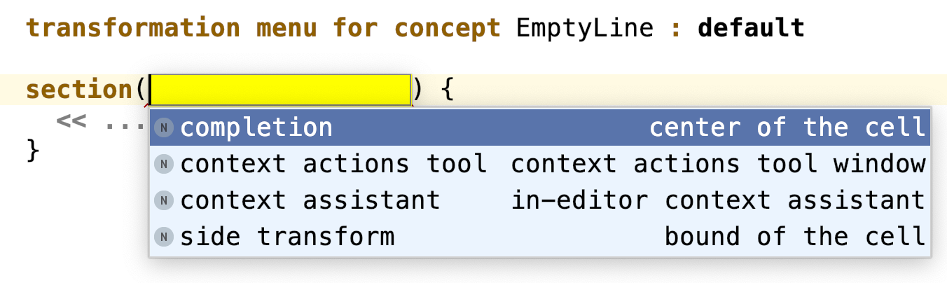 The language also enables language designers to include items of the side-transform menu to the completion menu on a specific cell. To do this you attach to the desired cell a transformation menu that contains a completionsection. That completion section will hold an include menupart and specify the location of side transform. The items of side-transform menu will be included to the completion.