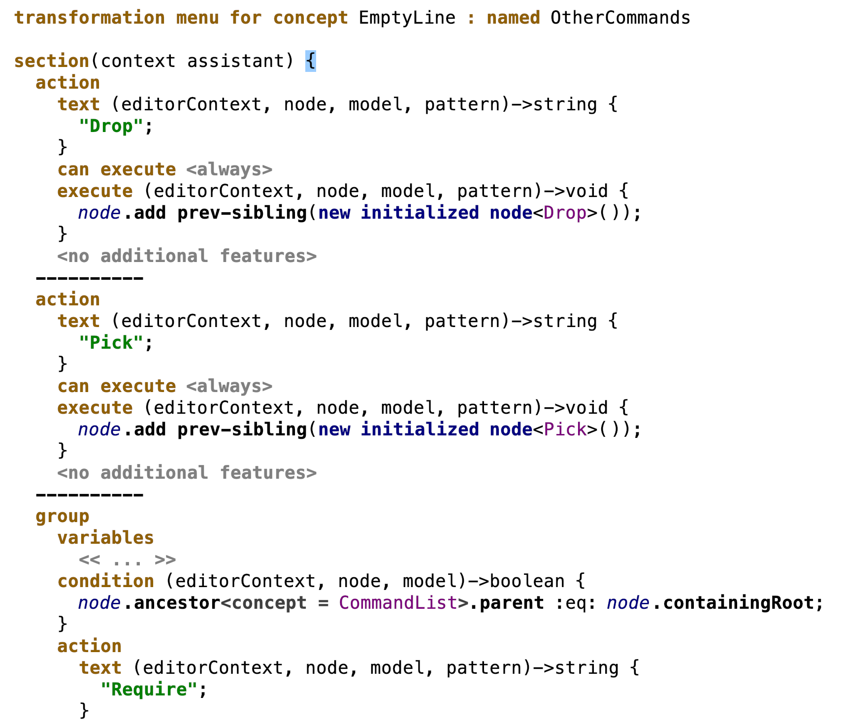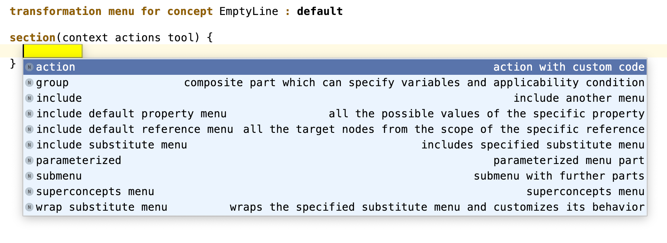 Each concept has a default transformation menu associated. If the language designer does not provide one explicitly, a transformation menu defined for the closest super-concept is assumed. If none is specified for any of the super-concepts, the one defined on BaseConcept is used, which contains the substitute actions suitable for that position (see below the section on substitute actions).