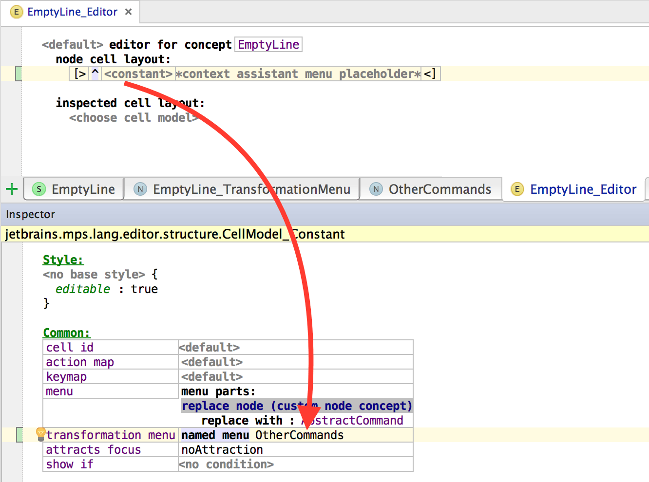 The customization of the menu for the property/reference cells can be done with the property/reference transformation menu parts . Suppose you want to customize the completion menu of the reference/property cell. Previously, it could have been done by defining the "inline menu" in the inspector. Now it can be done also via the Transformation Menu. We have introduced the property and the reference transformation menu parts. The reference transformation menu part includes the actions, which set the target node to the specific reference. The target nodes come from the scope for that reference. The same goes for the property menu part: it takes the values of the property type and includes actions, which set the value to the specific properties.