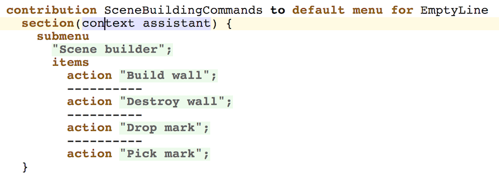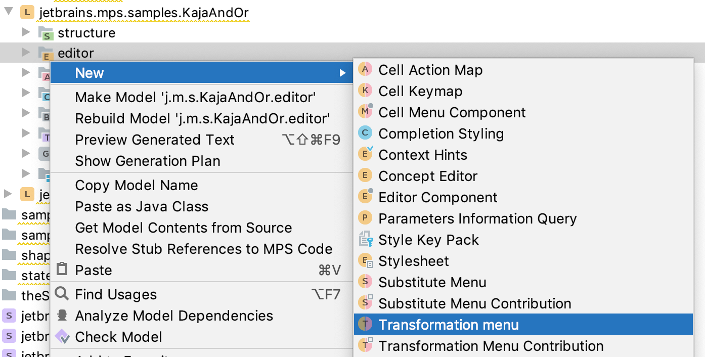 Transformation menu language is used to define transformation menus that describe a hierarchical structure of submenus and actions that will appear in various locations in the editor. Currently there are several possible locations where transformation menus are shown: side transform menus, substitute menuscontext assistant, and context actions tool. Language designers and plugin authors can define additional locations and specify required or optional features for each location (such as an icon or a tooltip), as documented in Extending the Transformation Menu Language.