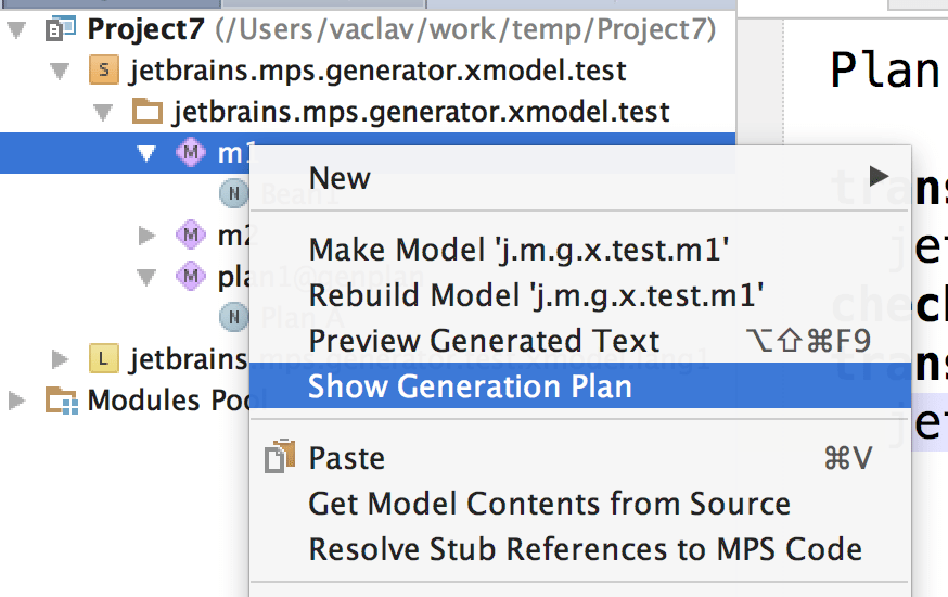 After importing the jetbrains.mps.lang.generator.plan and jetbrains.mps.lang.smodel languages, you can create root node of the Plan concept, which will represent your generation plan: