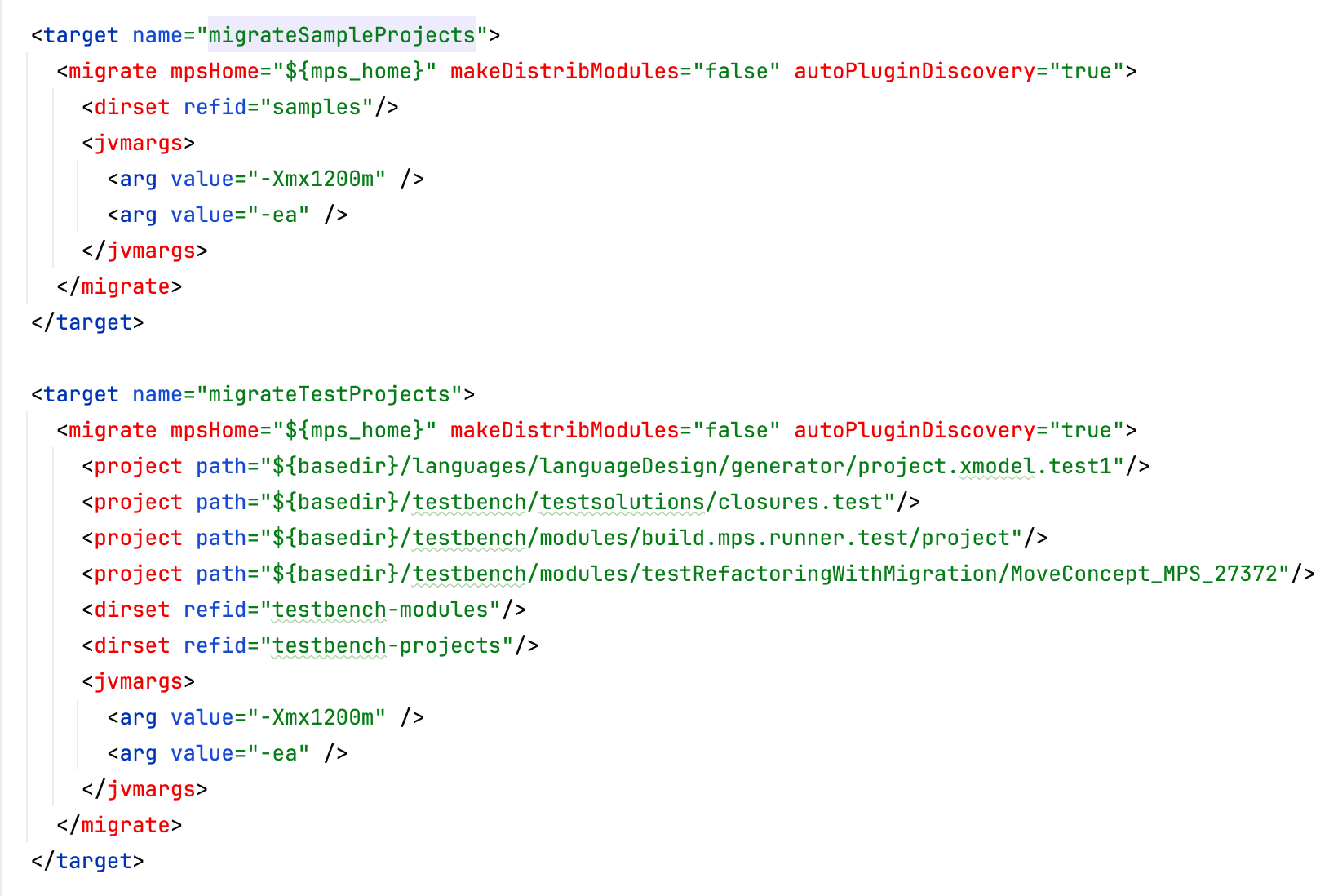 The task supports multiple project specifications (you can migrate several projects at once). Either use nested <project path="”/> elements or a regular Ant’s <dirset> to enumerate project locations for the task.