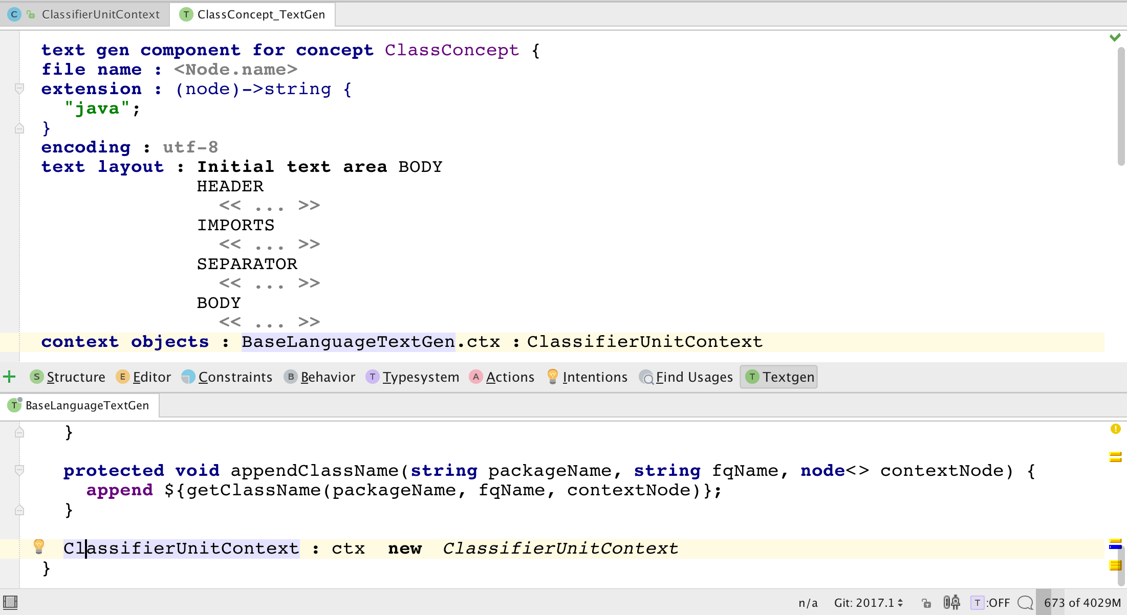 It is vital for certain model-to-text conversion scenarios to preserve some context information during TextGen. In BaseLanguage, for example, TextGen has to track model imports and qualified class names. The cumbersome and low-level approach of previous versions based on direct text buffer manipulation has been replaced with the possibility to define and use customized objects as part of the concept's textgen specification.